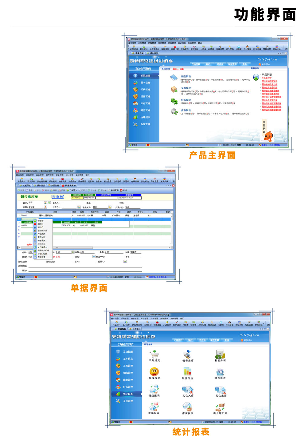 | 易特陶瓷建材進(jìn)銷存是一款專業(yè)的瓷磚,建材銷售管理軟件,針對(duì)陶瓷建材行業(yè)的特點(diǎn)設(shè)計(jì),如瓷磚的色號(hào)管理,其中包含商品銷售管理系統(tǒng) ,庫(kù)存管理系統(tǒng)(倉(cāng)庫(kù)管理系統(tǒng)),財(cái)務(wù)和報(bào)表系統(tǒng)等子模塊。軟件界面設(shè)計(jì)簡(jiǎn)潔,美觀,其人性化的軟件流程,使普通用戶不需培訓(xùn)也能很快掌握軟件操作使用方法,上手極易。強(qiáng)大報(bào)表與集成查詢功能是本軟件的最大特色,所有功能在用戶需要的使用地方自然體現(xiàn),不用打開多個(gè)窗口重復(fù)查詢。易特進(jìn)銷存軟件廣泛適用于企業(yè),商貿(mào)公司,個(gè)體門店等用于商業(yè)銷售管理, 庫(kù)存管理,財(cái)務(wù)管理等,客戶管理,員工管理等場(chǎng)合,是您企業(yè)進(jìn)行信息化管理的強(qiáng)大工具。 基礎(chǔ)數(shù)據(jù):商品信息,供應(yīng)商,客戶,商品分類,倉(cāng)庫(kù),銀行等基本信息的設(shè)置。 入庫(kù)管理:進(jìn)行貨品采購(gòu)入庫(kù),采購(gòu)?fù)素洠M(jìn)貨單據(jù)和退貨單據(jù)查詢,供應(yīng)商往來(lái)帳務(wù),供應(yīng)商付款。 出庫(kù)管理:銷售出貨,客戶退貨,銷售單據(jù)和客戶退貨查詢,客戶往來(lái)帳務(wù),客戶付款。 庫(kù)存管理:包括庫(kù)存之間貨品調(diào)拔,庫(kù)存報(bào)損、報(bào)溢,庫(kù)存盤點(diǎn)功能。 統(tǒng)計(jì)報(bào)表:完整的統(tǒng)計(jì)查詢功能,每張單據(jù)每次業(yè)務(wù)金額都可以清楚的反映。 權(quán)限管理:可添加刪除系統(tǒng)操作員帳號(hào),強(qiáng)大的權(quán)限控制,可以設(shè)置某用戶對(duì)某窗口某個(gè)按鈕的權(quán)限。 打印設(shè)計(jì):可對(duì)系統(tǒng)內(nèi)每個(gè)單據(jù)進(jìn)行打印的格式設(shè)計(jì),可以導(dǎo)出,導(dǎo)入,每個(gè)操作員可設(shè)計(jì)自己的打印格式。 界面設(shè)計(jì):系統(tǒng)窗口界面名稱可以自定義設(shè)計(jì),表格的顯示順序,寬度,是否顯示等,每個(gè)操作員可以設(shè)計(jì)自己的界面。 系統(tǒng)設(shè)置:可以靈活設(shè)置系統(tǒng)小數(shù)位數(shù),可選0-6位,讓帳務(wù)更精確,可對(duì)以往數(shù)據(jù)進(jìn)行選擇性的清除,以便系統(tǒng)初始化。 數(shù)據(jù)備份:可隨時(shí)對(duì)系統(tǒng)數(shù)據(jù)庫(kù)進(jìn)行安全備份,以防數(shù)據(jù)丟失。 |