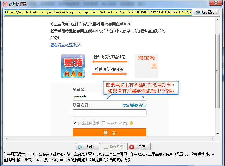 打開窗口登陸旺旺后可以自動完成授權。 |