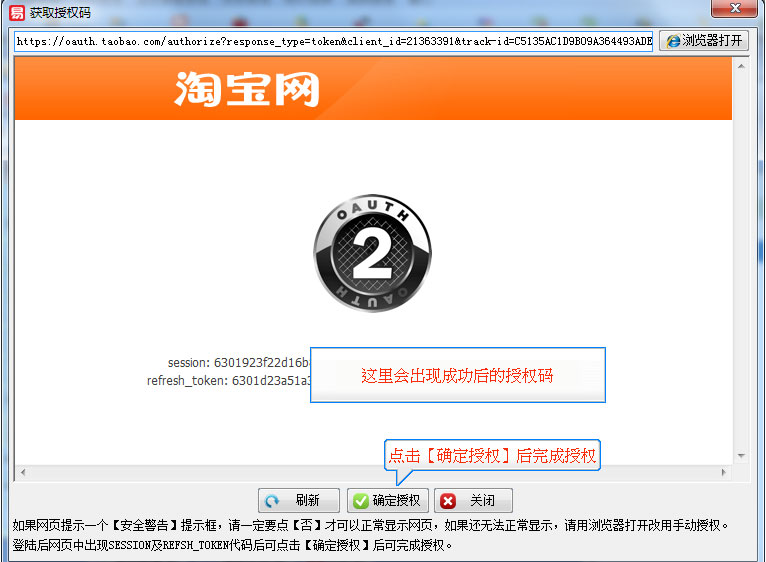 手動輸入session及refresh_token后進行授權,可用于管理多個非本地的店鋪。 |